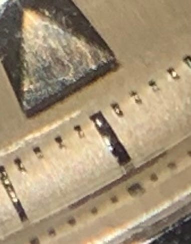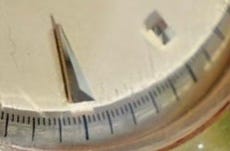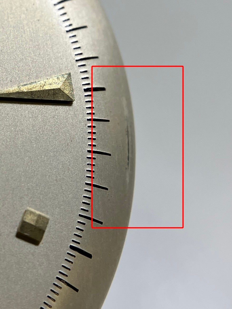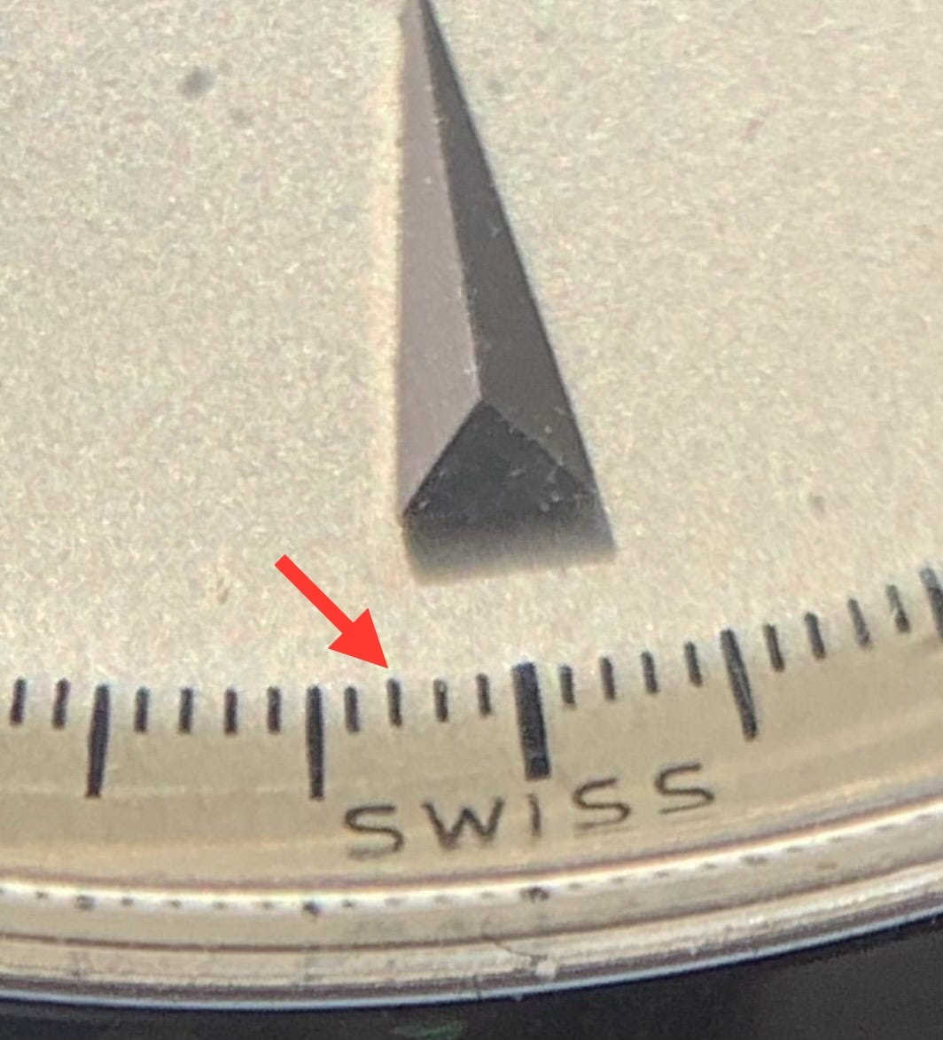 Interestingly, the minute track on both Type 1 examples shows some mis-aligned hash marks around the periphery. This mis-alignment of certain hash marks should be consistent in appearance on original dials (above image). The misalignment is from the cliche that was used to stamp the dials prior to having aqueous enamel paste applied and kiln fired to harden. The earlier image gives a good illustration of the two-tone gradient change of the dial just beyond the minute hash marks.