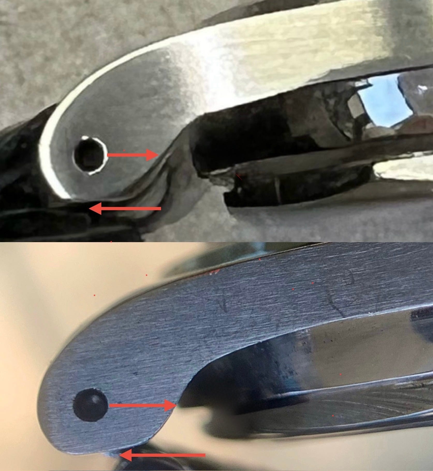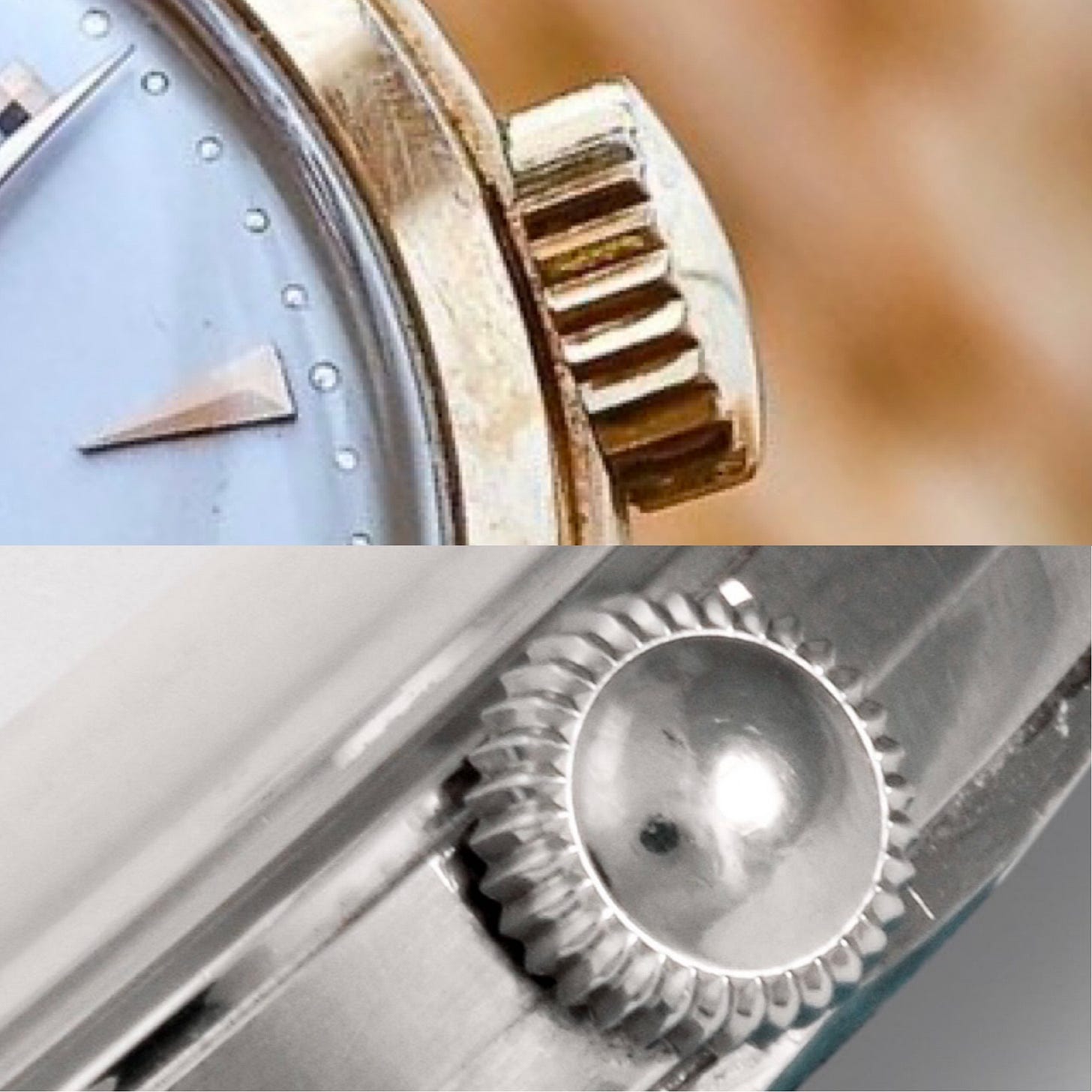 On steel cases we see subtle differences as well pointed out in the second comparative image. The lugs also appear slightly thicker than gold case examples and the lug tip base is approximately 1-2mm longer.