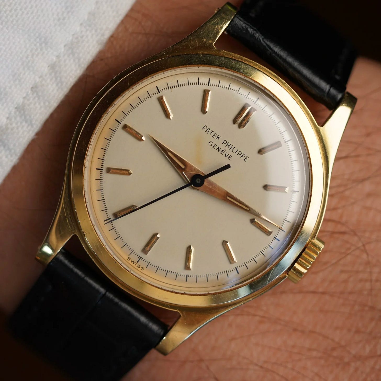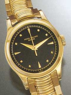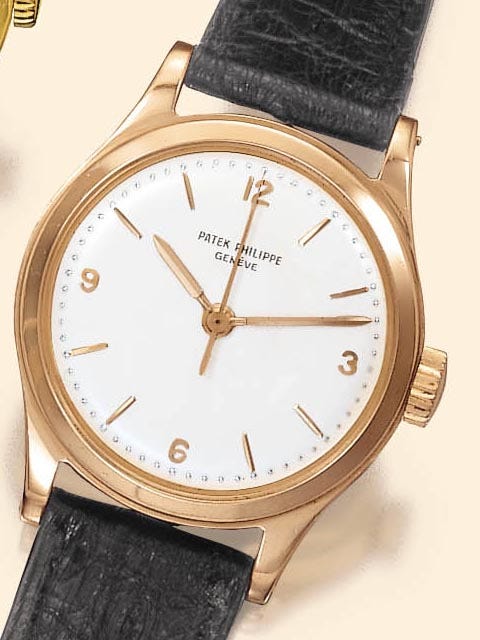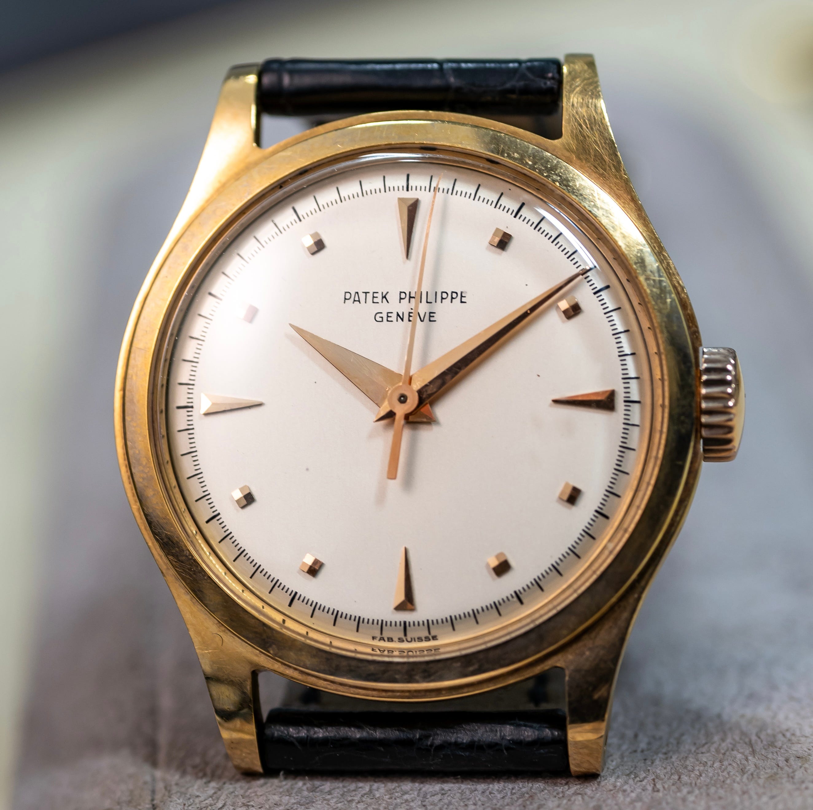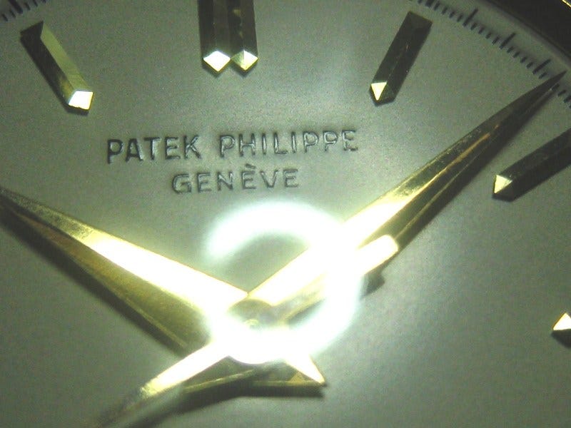 Type 2B - The markers are lapped with gold dauphine or baton hands and either a blued or gold center sweep seconds hand. The later steel cased examples have a printed signature. A period image is depicted of this dial type on a gold model from 1959 in Huber & Banbery, Patek Philippe Geneve on pg. 249.