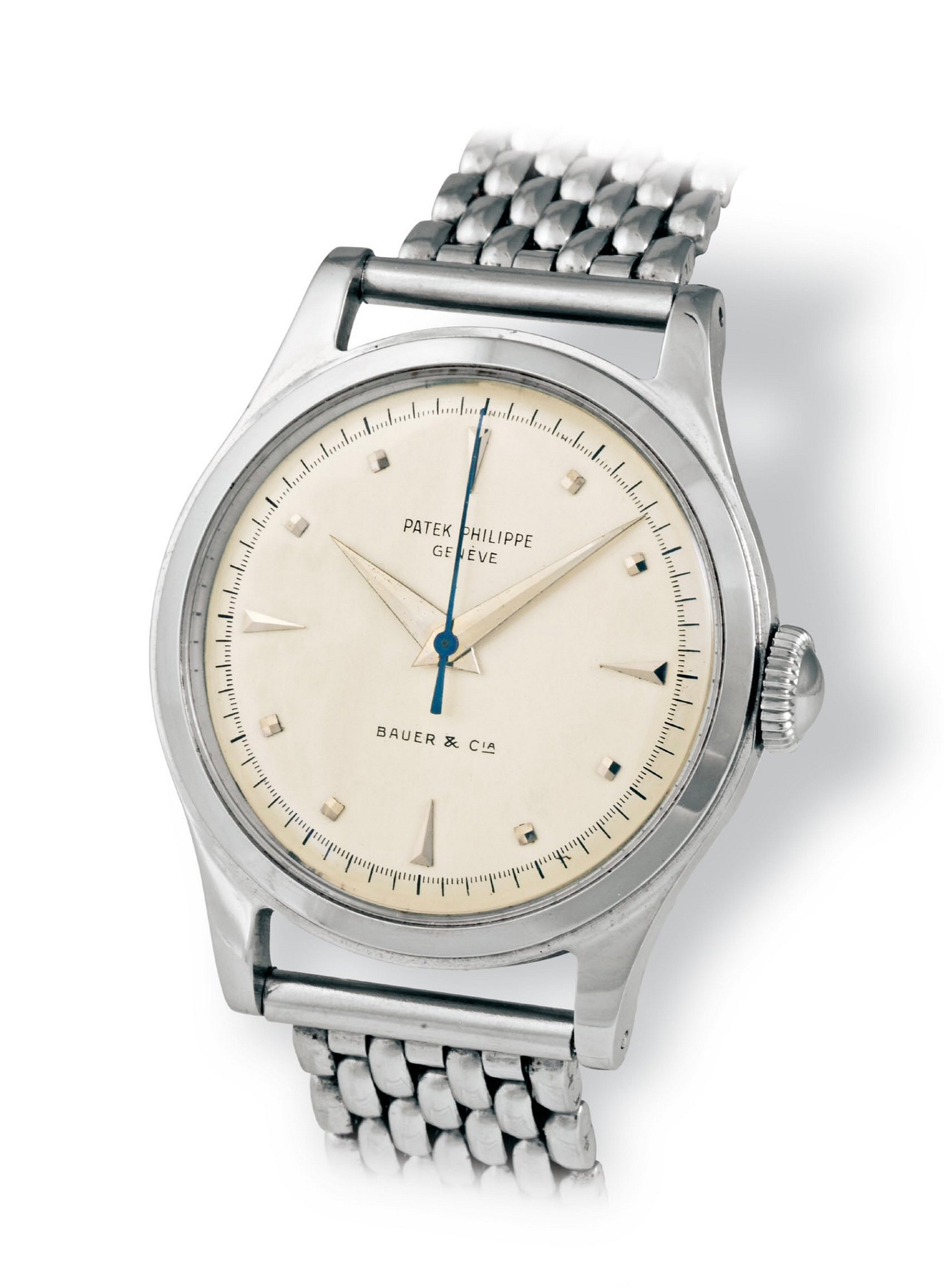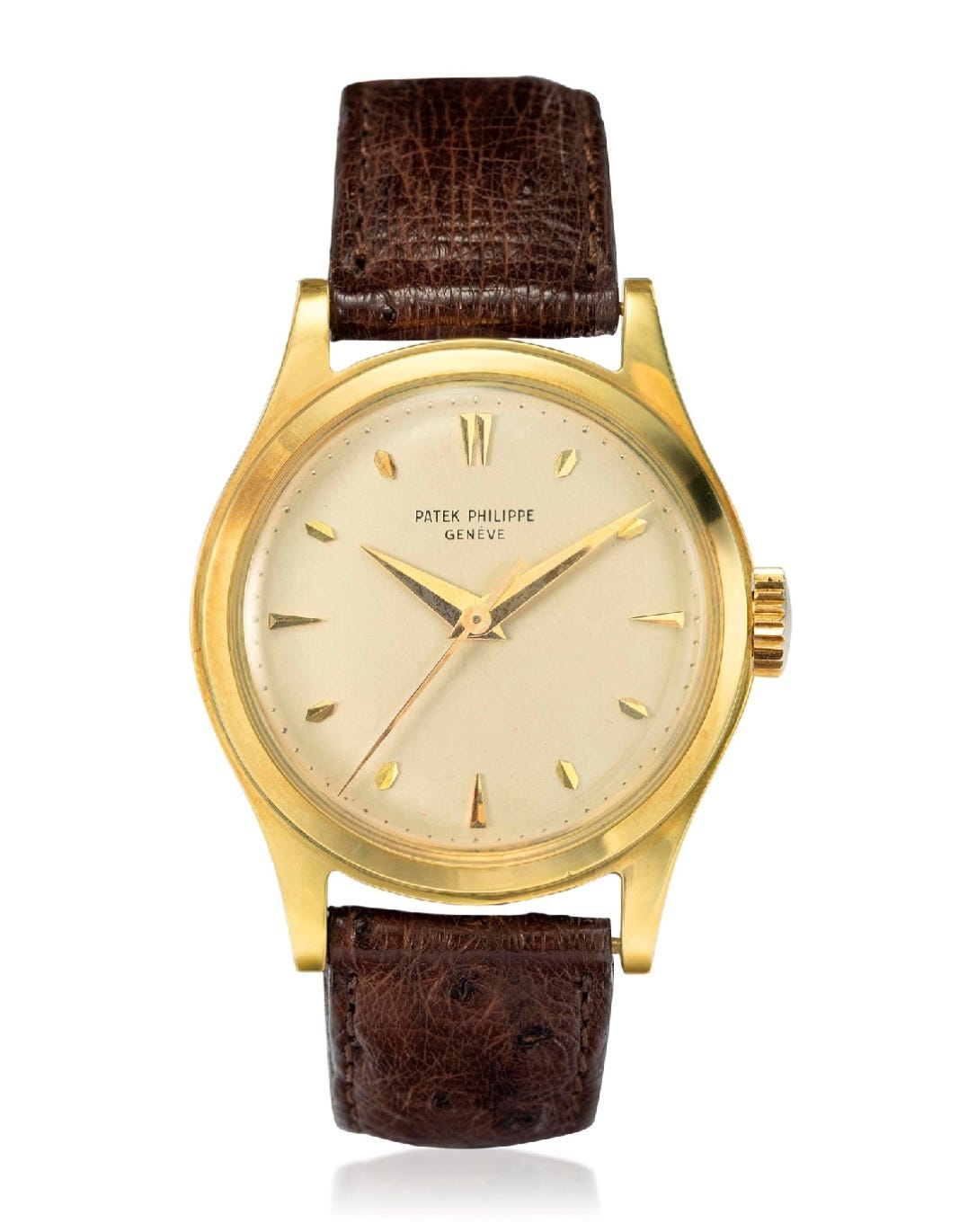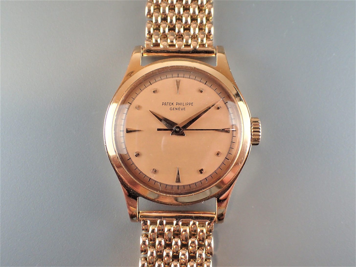 Type 2B - The markers are lapped with gold dauphine or baton hands and either a blued or gold center sweep seconds hand. The later steel cased examples have a printed signature. A period image is depicted of this dial type on a gold model from 1959 in Huber & Banbery, Patek Philippe Geneve on pg. 249.