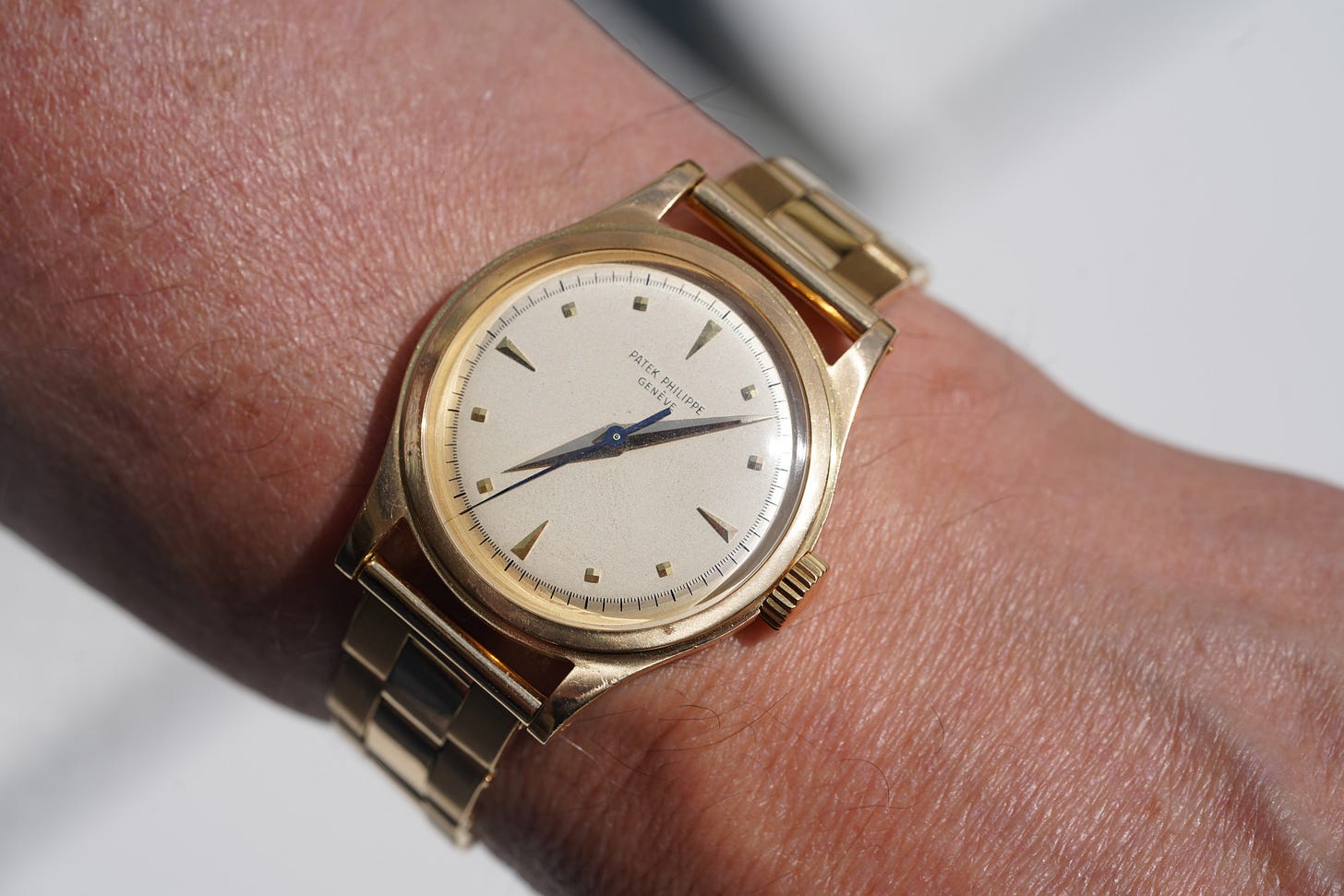 Type 2A - Although less commonly known, some examples are noted with this appearance in the market overlapping the Type 1 dials. This type features geometric markers, similar to 1A, gold dauphine hands and either a blued steel or gold center sweep seconds hand. I’ve only seen this type in yellow and rose gold and around 1956.