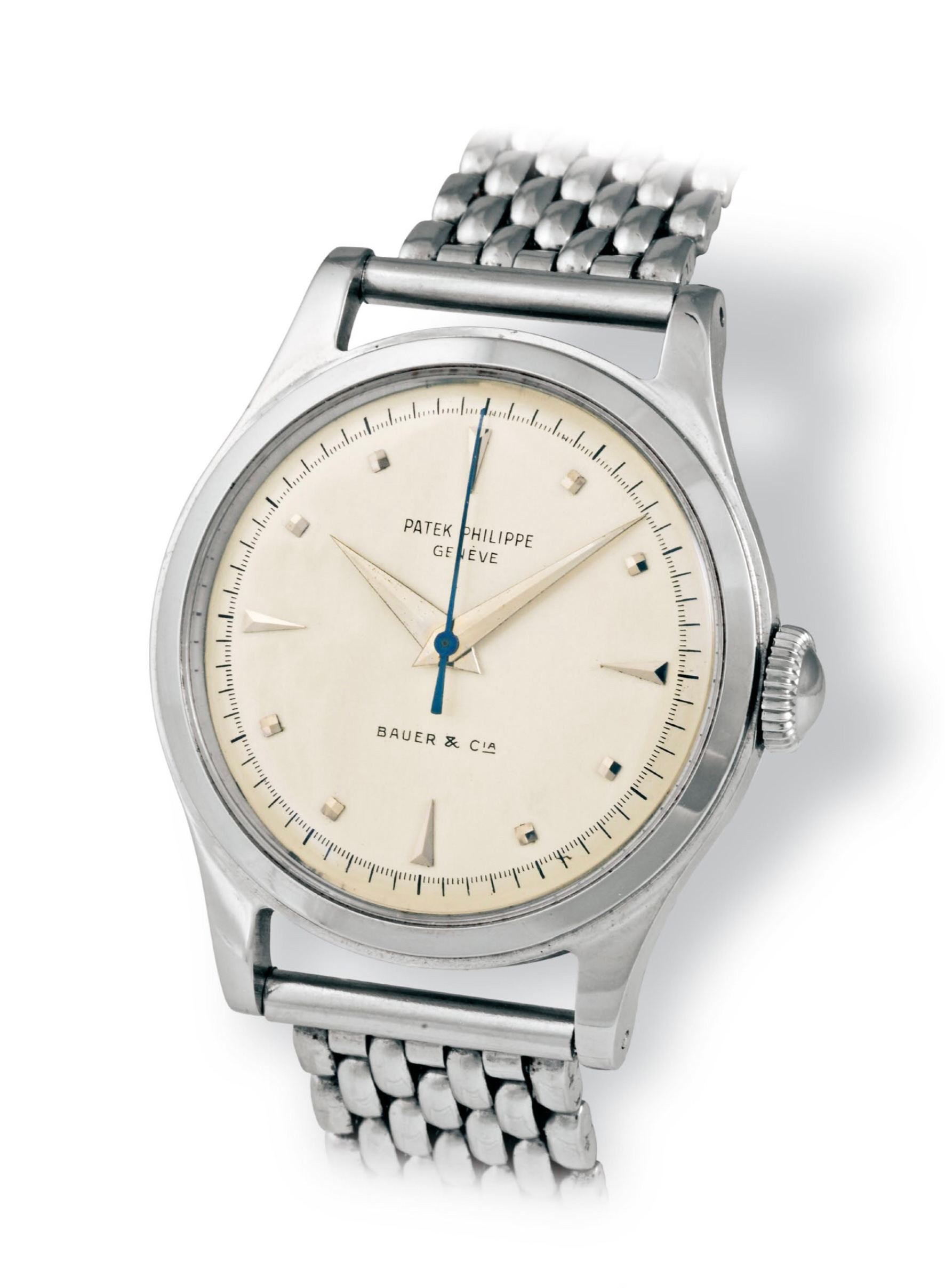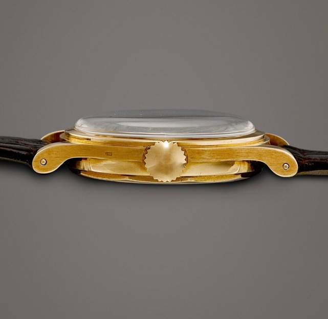 Some past auction reports refer to the two-part case as the first Patek waterproof design, however the ref. 565 introduced in 1938 holds that distinction. The taller center seconds movement gives the case a bit more height, when compared to the flatter ref. 2509 sibling.