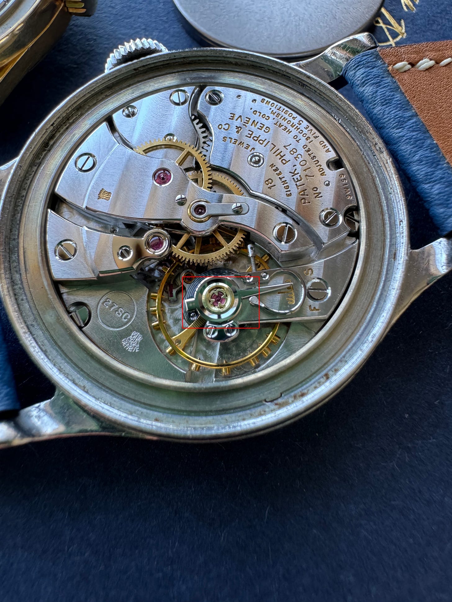 The 27 SC caliber was developed by Patek around 1949 and powers the ref. 2508. The 27 SC movement featuring a direct drive succeeded the 12-120 SCi caliber and solved the “shudder” of the minute hand seen on the previous Victorin-Piguet design. The early 27 SC movement used a weighted monometallic balance, which was later transitioned to the Gyromax balance. This movement features the usual beautifully finished plates with Geneva waves, lower plate perlage and polished anglage on the edges per Patek standards. Two Geneva seal stampings are seen on the movement and a circled, stamped “27 SC” to denote the caliber.