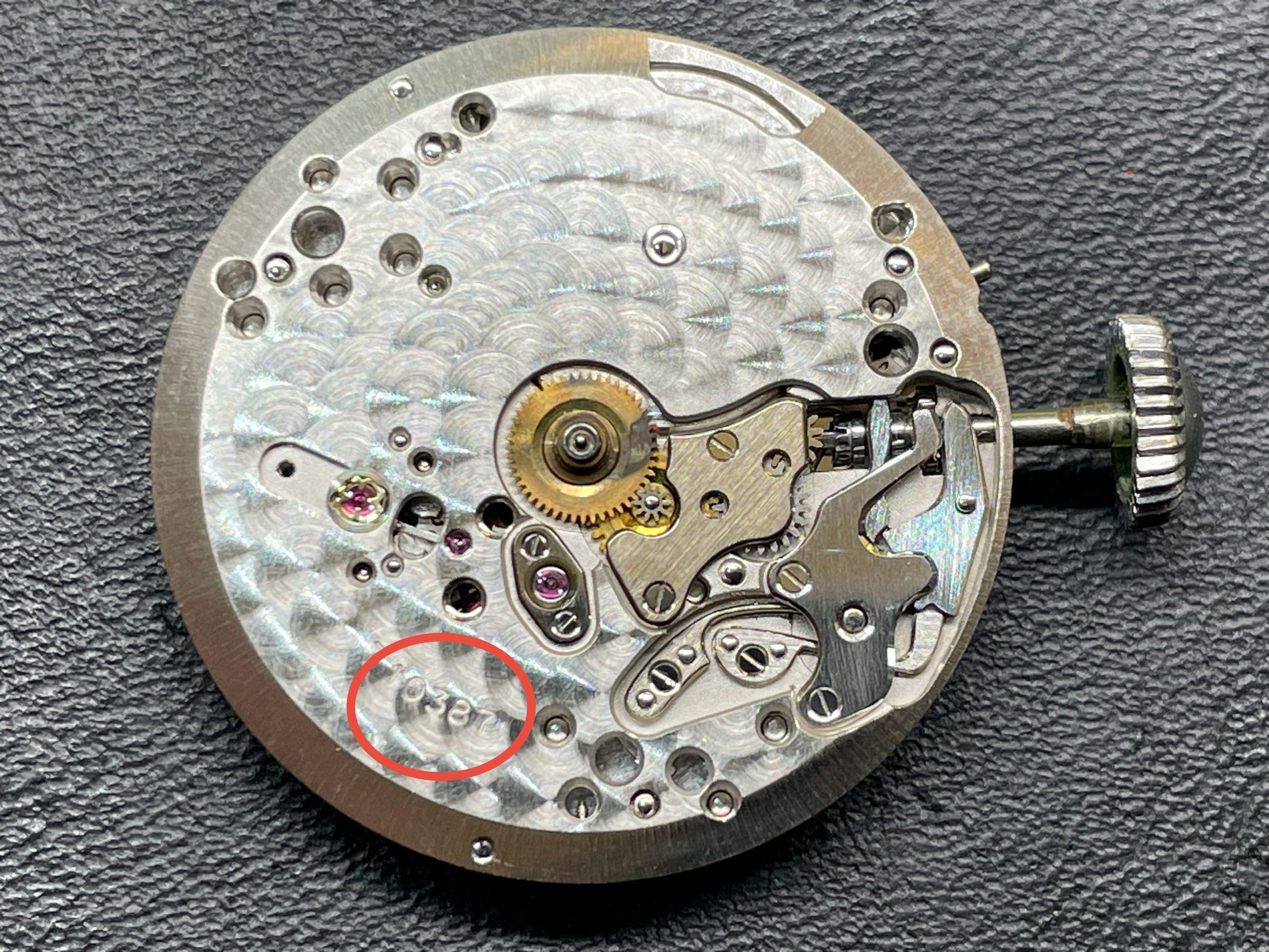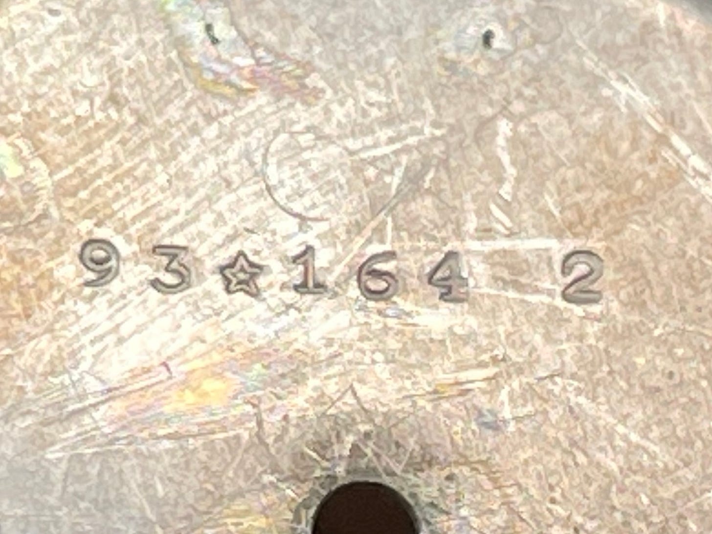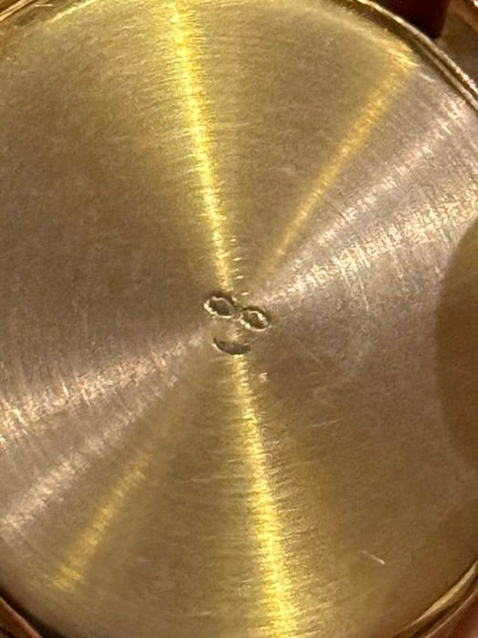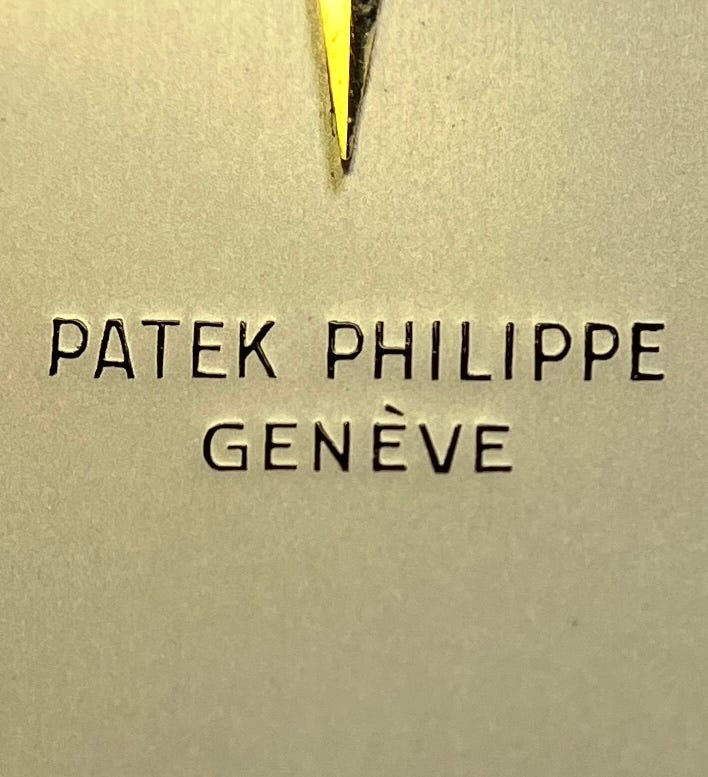 The backside of the dial is stamped 93 which is the code for Patek Philippe. The star symbol is for the Stern Freres dial manufacture. Next in line is a three-digit batch code number, with the last number referencing the dial color.
