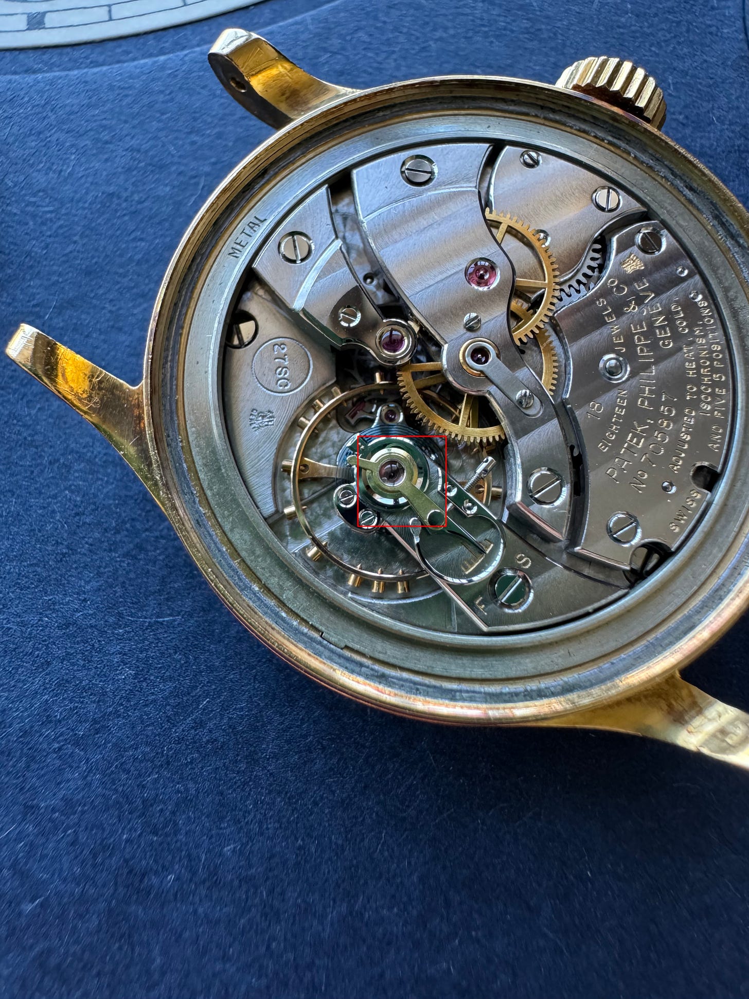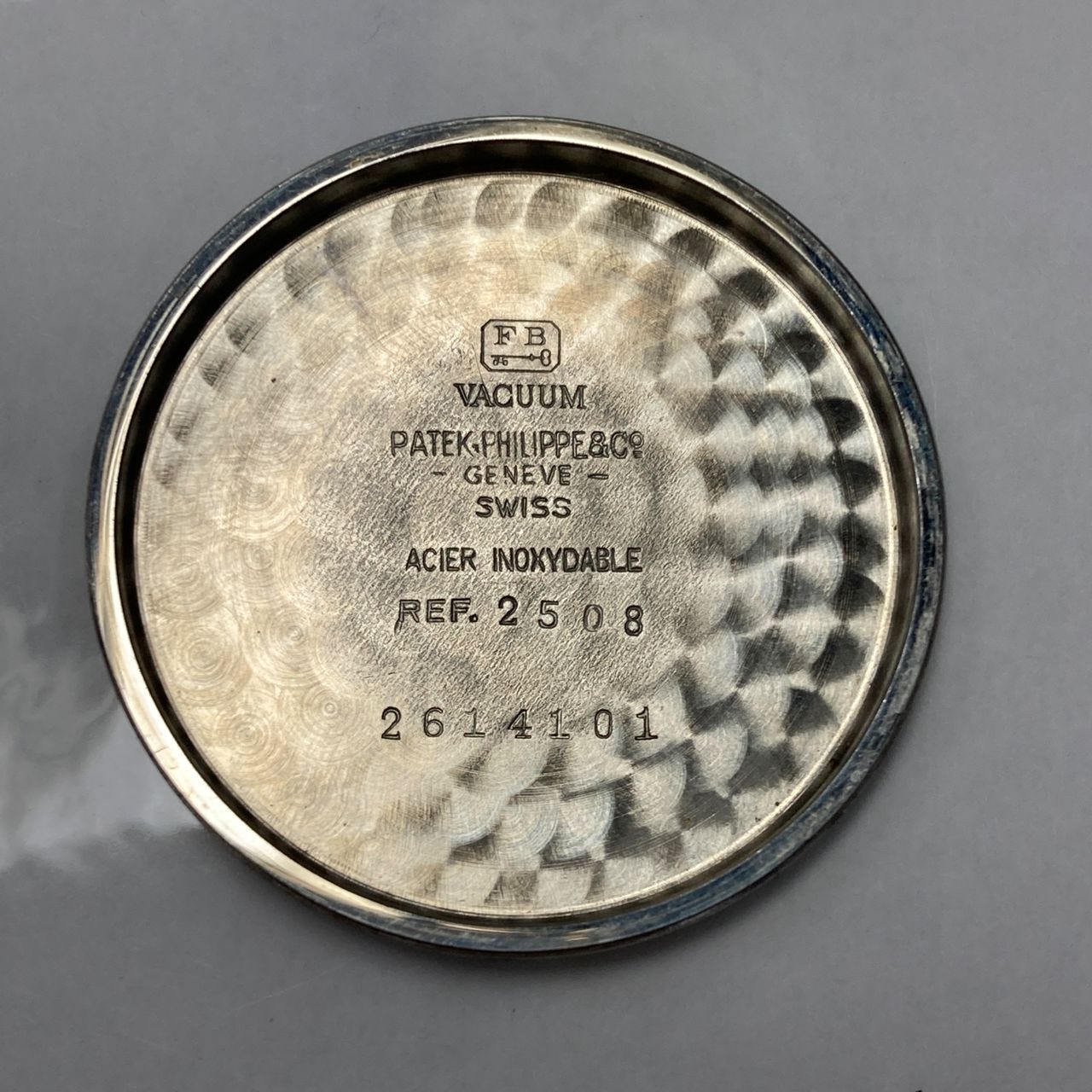 The inner case-back features the usual makers marks with stampings for FB/Taubert and Patek Philippe. In addition you should see the required gold markings, reference and serial numbers. The gold cases have the additional stamped Key 11 for Taubert, whereas the steel examples do not. Earlier cases have a cross symbol under the FB Taubert stamp, while later cases had the word “VACUUM” stamped. Presumably the stamps signified confirmation of case integrity testing.