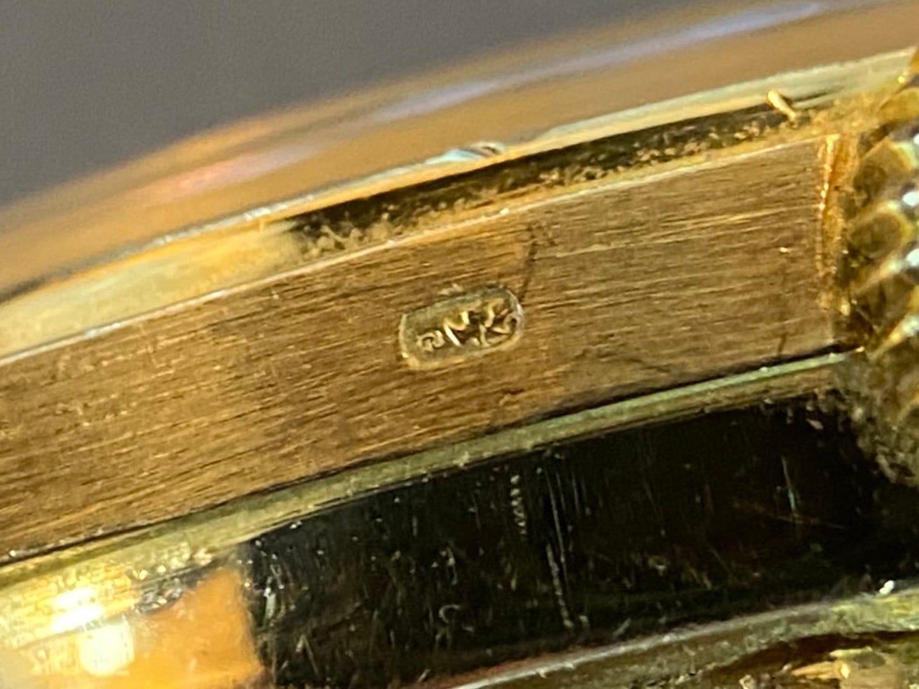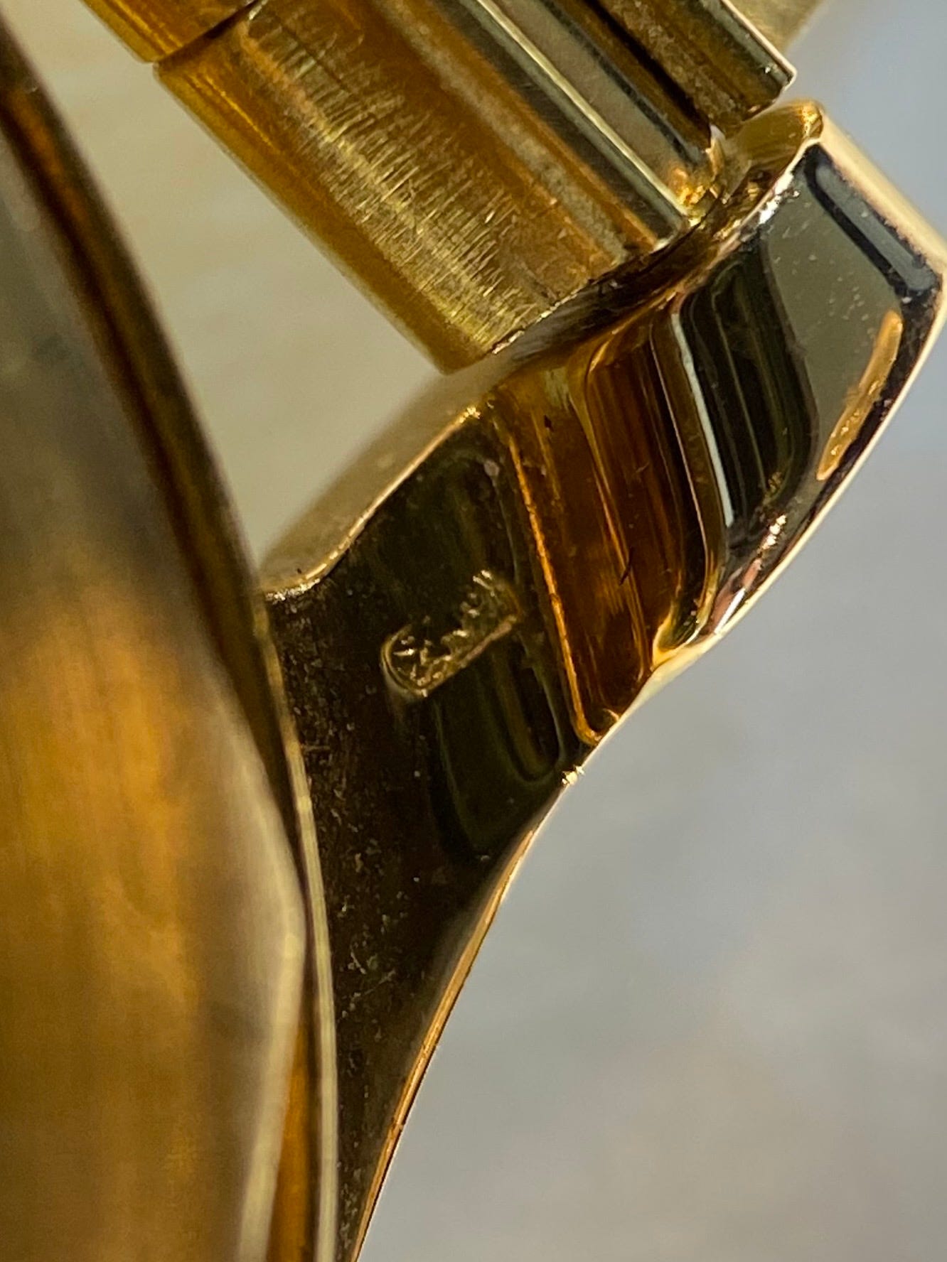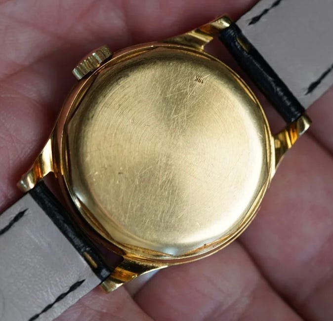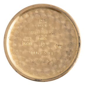 The case is polished and satin brushed on the sides with a circular brush finish on the case back. Gold cases often have hallmarks under one lug and on the crown side case band or on the back of the case. French examples have a hallmark on the case back as noted in this rose example from 1961.