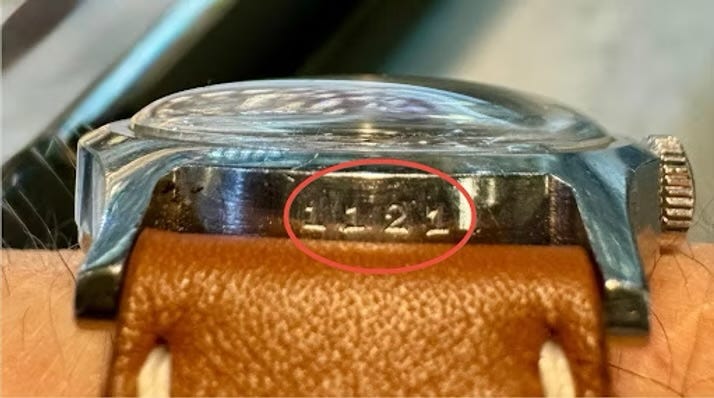 Some additional evidence of this correctness is seen on the inside case back stamping, which confirms the stamping between the lugs to match the last four serial numbers of the case back.