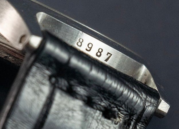 As mentioned, on certain early waterproof wristwatches, notably the Patek Philippe Reference 565 (late-1930s – early-1940s), a stamped marking appears between the lugs, generally consisting of four digits. This number corresponds to the last four digits of the case number engraved inside the case-back. It functions as an assembly mark, ensuring the correct matching of the case components.