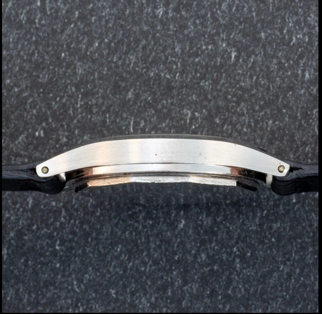 The FB/Taubert designed monobloc case is very well proportioned, with a crisp bezel line that is often softened from past polishing on many examples. The case integrity is well preserved and notably absent of corrosion and pitting. This example appears to be the Type 1 case, displaying stubbier lugs and a convex recess point by the winding crown. Further observations on the evolution of case types seen across this reference over time can be found in my accompanying article HERE.