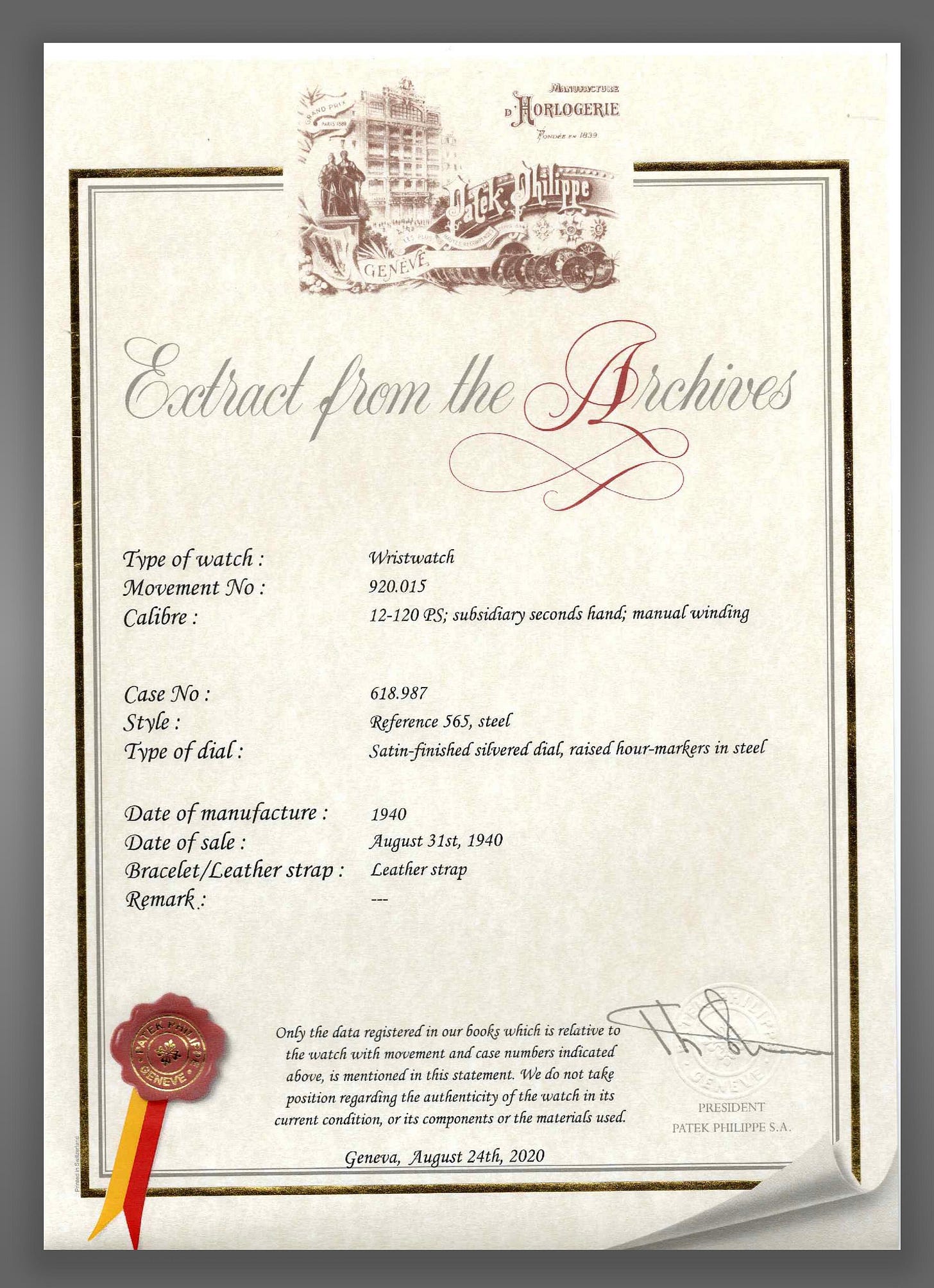 The subject example is especially noteworthy for featuring the storied South American retailer’s signature “Walser Wald” printed on the dial. In addition to being the only example known with this signature, the retailer name appears to be the original print known from the period, including its correct, relative placement on the dial. Often these can be reprinted after dial cleaning or restoration and difficult to reproduce properly to a trained eye. The engraved, enameled signature appears in its elongated form on examples up to the early ’40s. This long-form signature is distinguished by the inclusion of “& Co” at the end, whereas later examples adopt a more compressed configuration, still ending in “& Co” before the transition to a shorter “Patek Philippe” signature in the late ‘40s.
