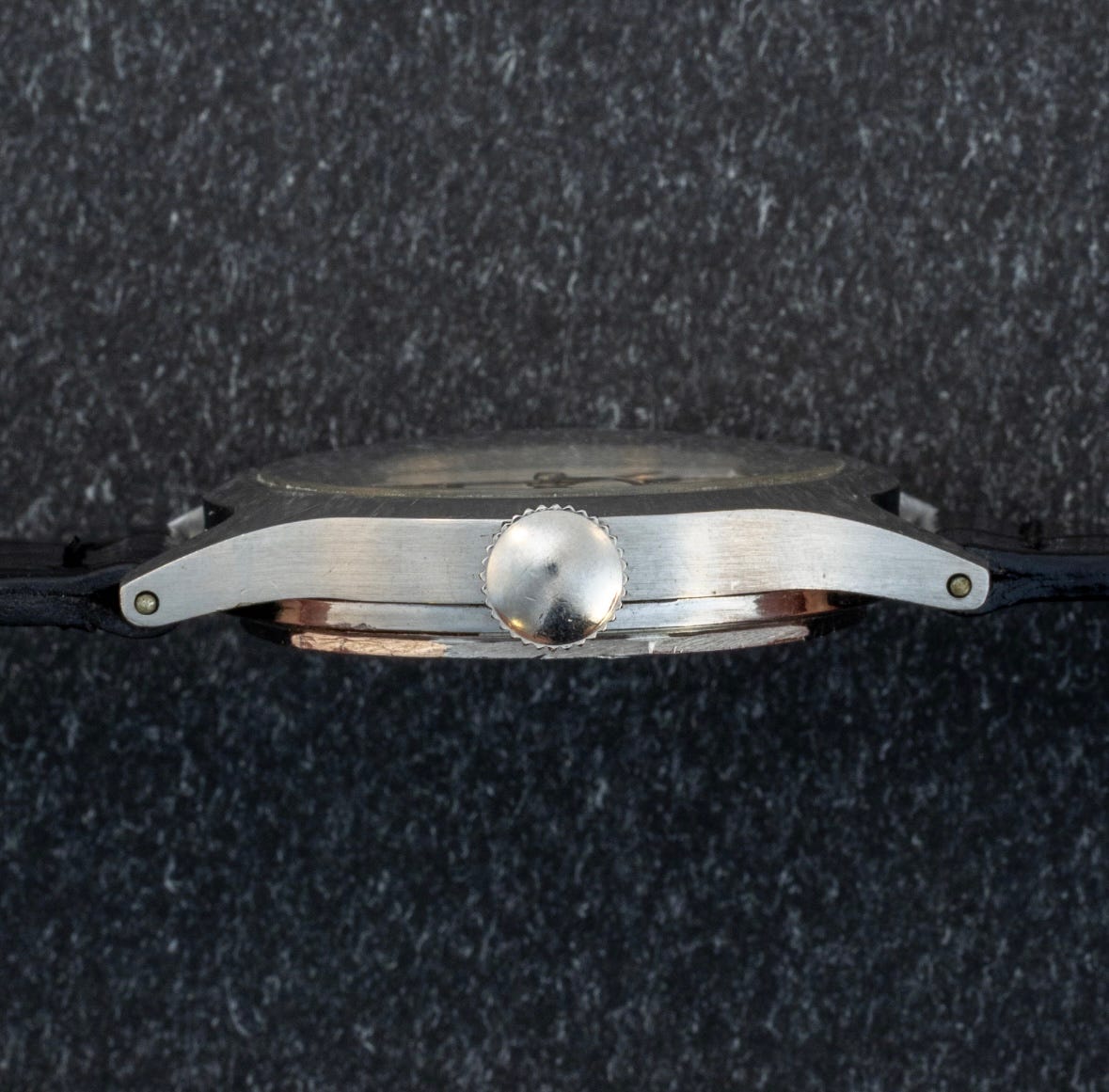 It is among very few known examples to pair a retailer signature with a serial number stamped between the lower lugs. The original, silvered dial is further distinguished by the aging of its original surface, which has developed a so-called “tropical” appearance. Particularly distinctive expressions of dial patina are often observed among examples originating from this part of the world, likely influenced by prolonged exposure to sun, heat, and humidity, which over time can produce varied and compelling surface characteristics. The stick markers have an outline surrounding them that resembles something of a neon light halo glow. In this case, the unique tropical patina also serves as an important indication of the dial’s original condition.